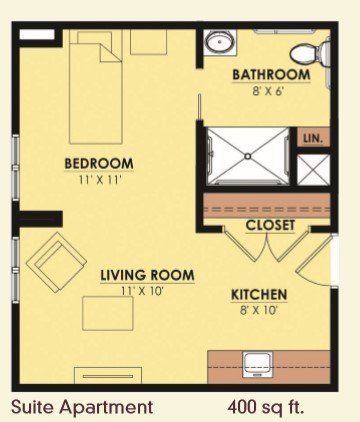 - Studio, suites, one- and two-bedroom apartments all with kitchenette and full bath. Private rooms with half bath.