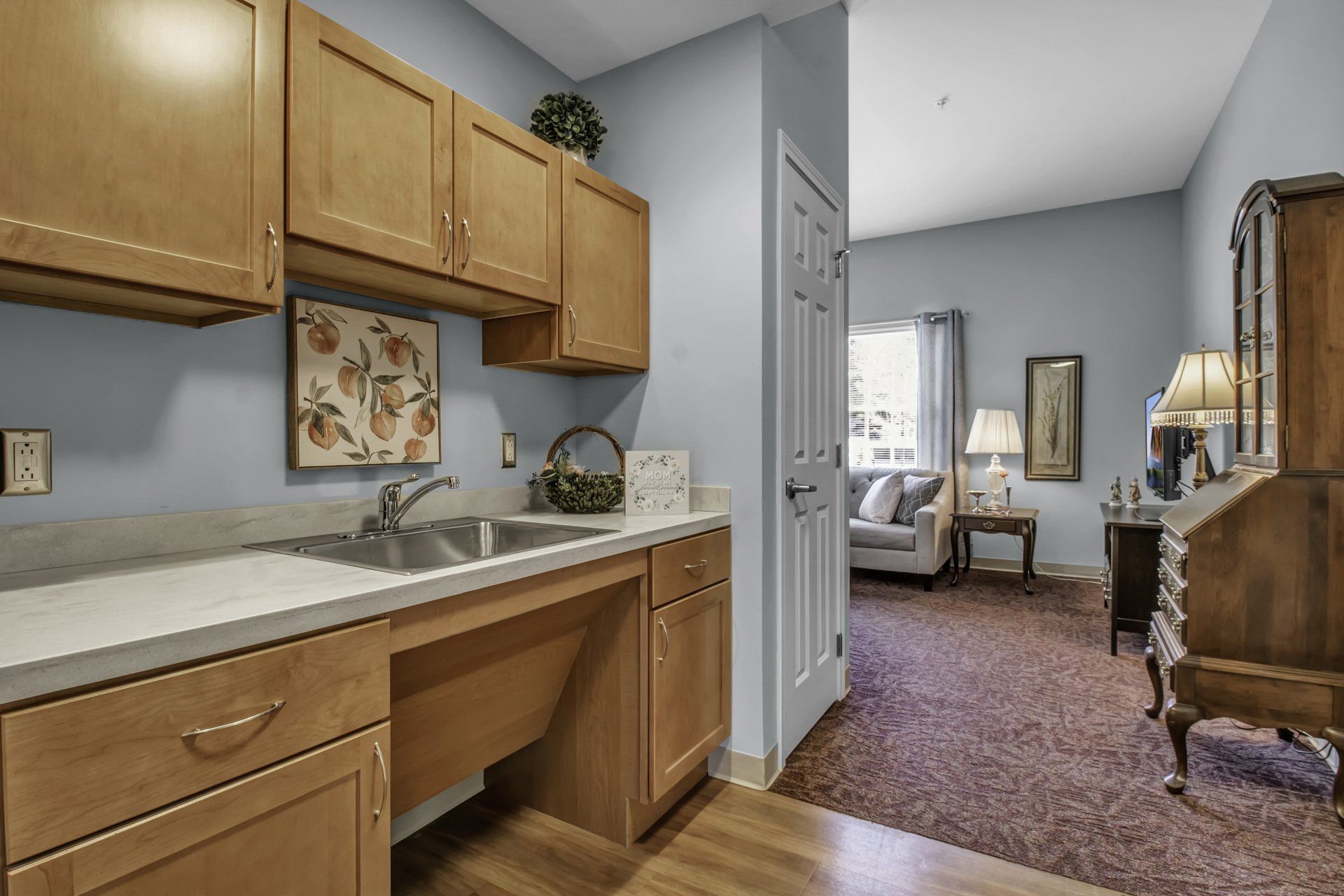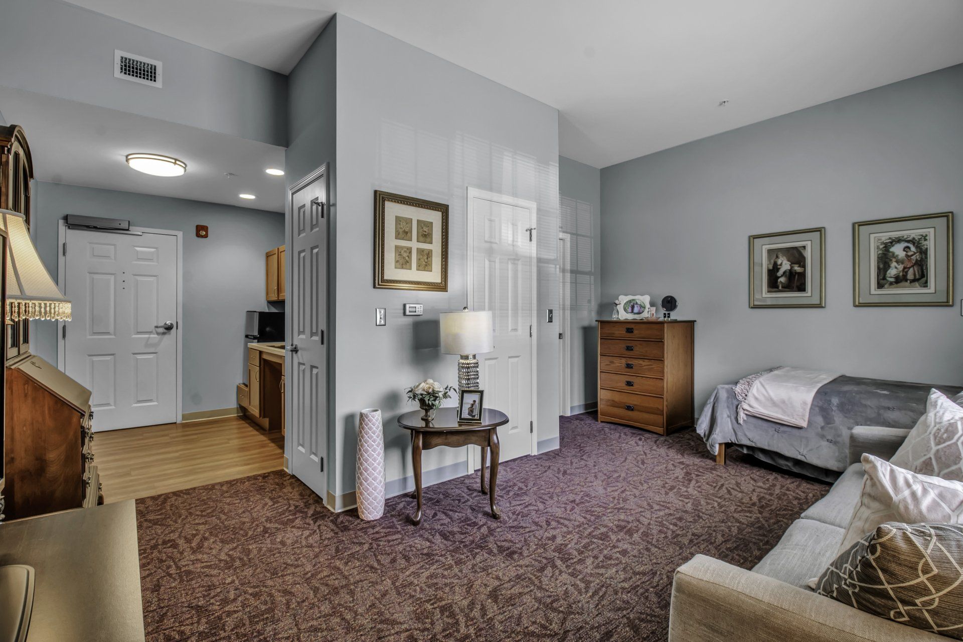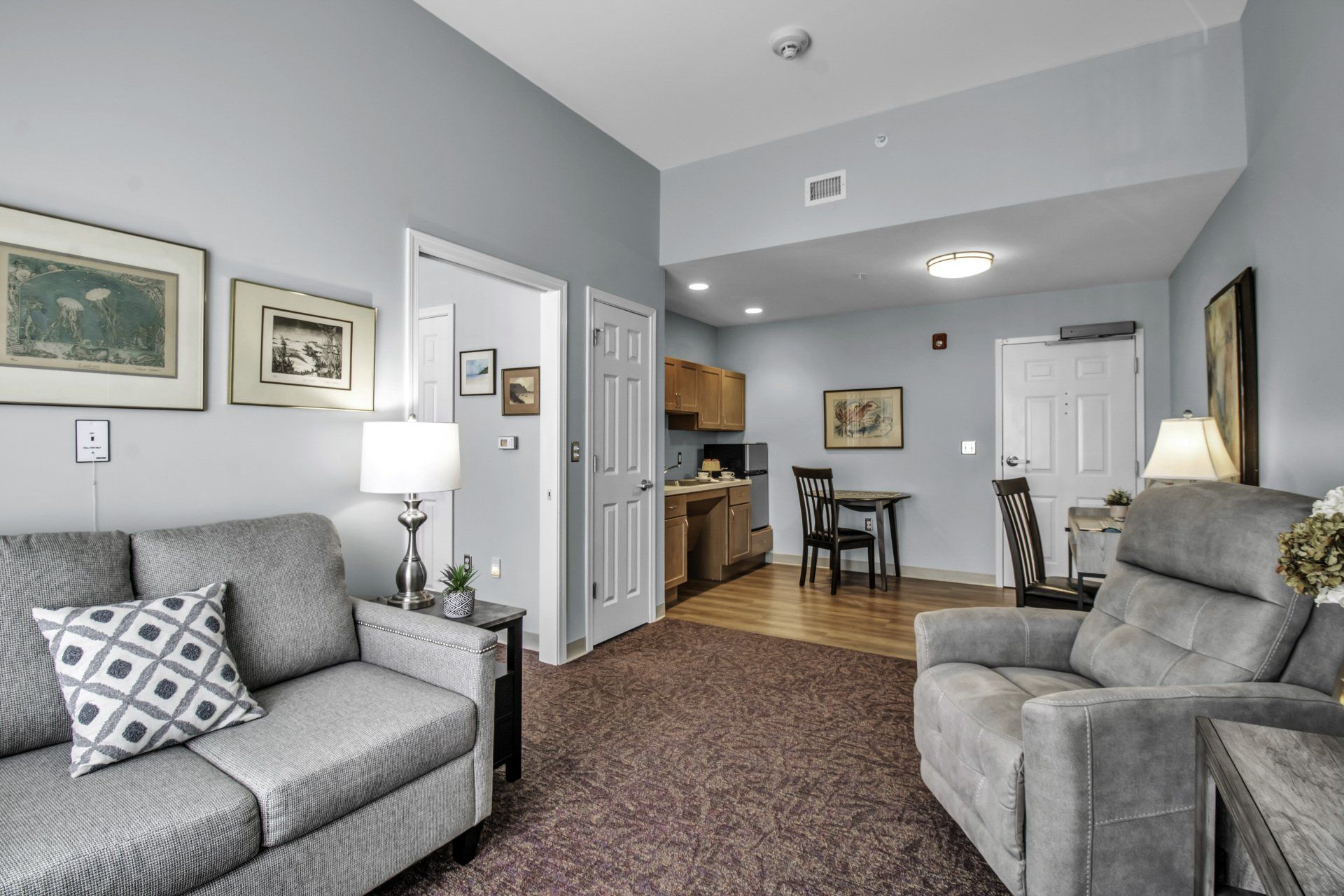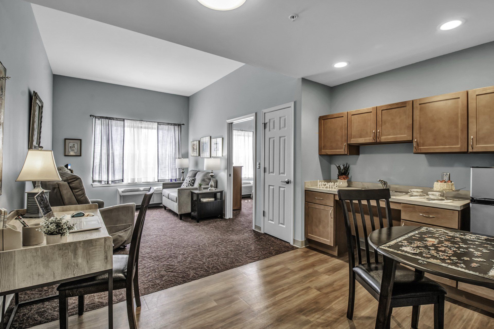 Our secure environment is thoughtfully designed to conjure memories of home. Residents feel relaxed in the welcoming atmosphere of a cozy country kitchen, living area, dining room and library/lounge. There’s even an enclosed patio and walking path with direct access from the dining room. Everyone contributes to the household routine, much like a family.